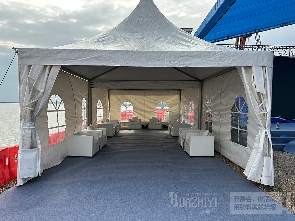 開工休息尖頂方形篷房為什么如此特別?現(xiàn)在市面上有很多不同風格的篷房,其中有一種叫做尖頂方形篷房,如圖就可以看到它的外形,頂部是尖尖的,內(nèi)部可以擺放休息沙發(fā),四周圍布帶有透明窗戶可以將自然光線投入篷房內(nèi)部,地上鋪裝有干凈整潔的地毯,就在戶外搭建出了一個臨時的開工休息尖頂方形篷房。如此特別,這是為什么呢?今天華之熠篷房廠家就給您介紹下這種類型篷房的特點。