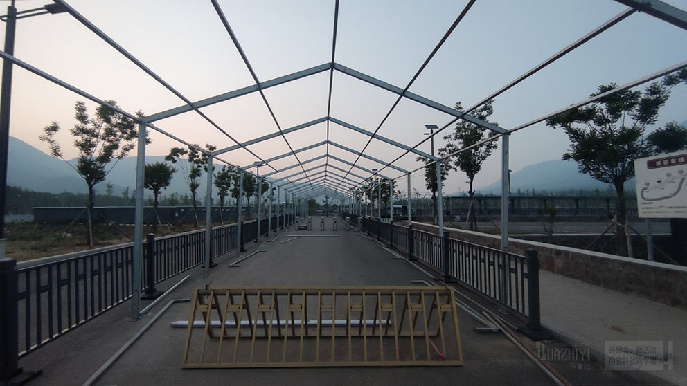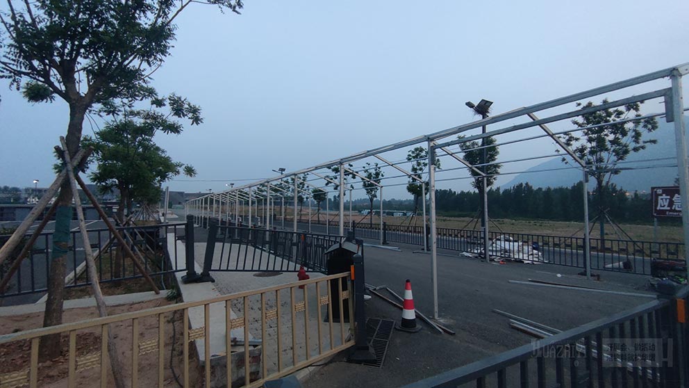 少林寺新停車場安檢篷房由鄭州篷房租賃廠家負責搭建,這顯示了華熠廠家在臨時建筑搭建領域的專業(yè)實力和豐富經驗。鄭州篷房租賃廠家以精湛的技術和優(yōu)質的服務,為少林寺新停車場打造了一個安全、穩(wěn)固且實用的安檢篷房。