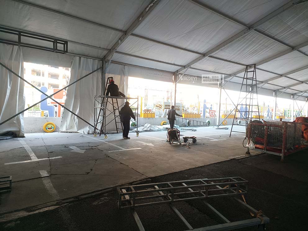 鄭州活動篷房出租篷內(nèi)還可以搭建桁架展位。鄭州華熠公司正在一處活動場地上搭建篷房,現(xiàn)在的篷房外部框架已經(jīng)落成,工人們正在搭建桁架展位,桁架展位可以進一步將篷房內(nèi)的空間進行劃分,使得空間多動能性增加不少。
