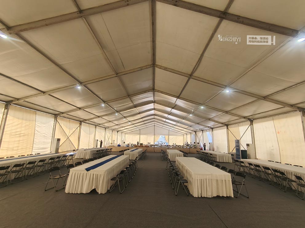 篷內(nèi)的布局兼顧實(shí)用與涼爽。長條桌兩側(cè)擺放著折疊椅,椅腿底部的防滑墊與篷內(nèi)地面的防滑地膠緊密貼合,即便有人突然起身,椅子也不會(huì)輕易滑動(dòng)??照{(diào)的布置讓清涼均勻覆蓋。濟(jì)源篷房租賃篷房內(nèi)配置了立式空調(diào),出風(fēng)口斜向地面 45 度,避免冷風(fēng)直接吹向人體??照{(diào)設(shè)定在 26℃的恒溫狀態(tài),冷凝水管被細(xì)心地引至篷外,地面看不到任何水漬。